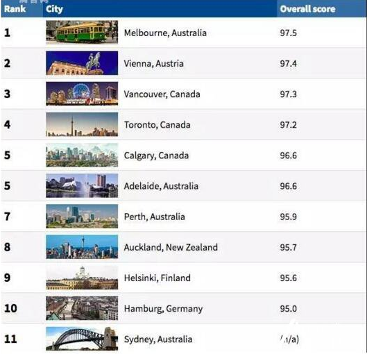 2017年全球宜居城市榜单前5位较上年没有变化。奥地利首都维也纳排名榜眼,加拿大城市温哥华及多伦多紧随其后。南澳首府阿得雷德以及加拿大城市卡尔加里并列榜单第5位。此外,西澳首府柏斯排名榜单第7位,而悉尼排名榜单第11位。