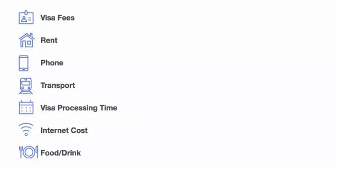 Nestpick主要考量了新移民来到这个城市第一个月的花销,包括签证费用、签证等待时间、房租、电话费、交通费、网络费和餐饮等方面的花销。
