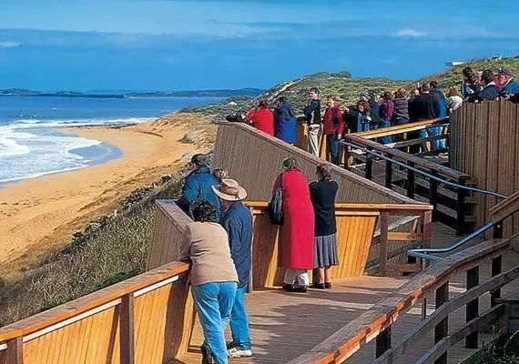 不仅如此,雄鲸、成年的鲸鱼和略大的幼鲸也会停留在稍远的海域里。作为游客,你可以在Warrnambool的Logans Beach鲸鱼观景台观赏到它们。