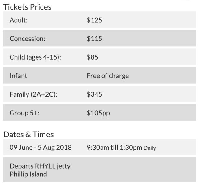 Phillip Island的官方旅游景点,推出了冬季观鲸邮轮(Winter Whale Cruise)套餐。它里面包括4小时的出海航行、海豹岩和海豚观景点的观赏,同时也表示有80%的机率会看到鲸鱼(但是并不保证每次都可以看到),