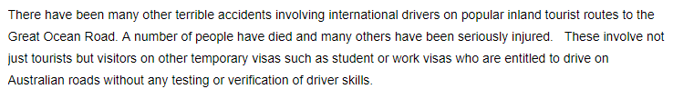 2、在澳洲境内已经发生了太多国际驾照持有者肇事的情况,这些人不只是游客,也可能是持有工作签证的打工者,或者是持有学生签证的留学生。