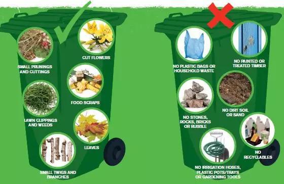 你知道澳大利亚街头随处可见的绿色垃圾箱是干什么用的吗?顾名思义,绿色垃圾箱用来丢弃我们的有机废物。有机废物的例子有插条、小树枝(最长10厘米)、草坪剪枝、杂草、树叶、切花、宠物粪便(但不包括装粪便的塑料袋)、碎纸片、纸巾和头发等。绿色垃圾箱不能用来装塑料袋、园艺工具或花盆之类的东西。