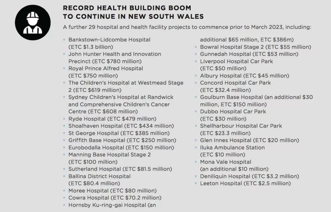 位于Randwick的Prince of Wales Hospital将提前至2024年完工,而Westmead Hospital分院的重建工作也将加快步伐,于2022年完工。悉尼西区的Nepean医院也将提前一年完工。