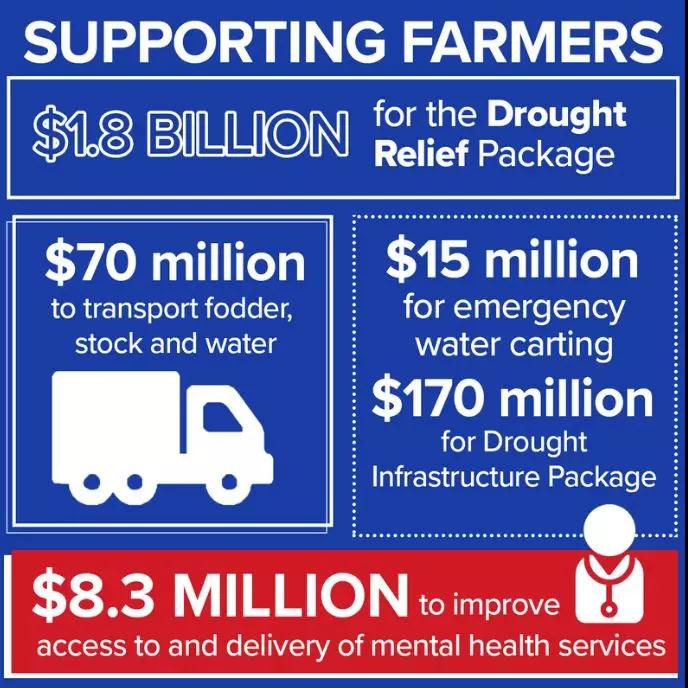 政府还将投入1.7亿澳元用于干旱拯救计划,1.85亿澳元用于农场干旱救济,3.5亿澳元投入农场基金,800多万澳元用于提高与干旱有关的精神卫生倡导。