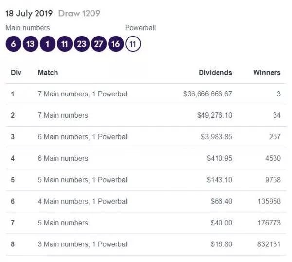 Oz Lotteries的官网显示,今天的中奖号码为6,13,1,11,23,27,16,强力球号码为11。《每日邮报》报道称,这3名一夜暴富的幸运儿分别来自新州、南澳和维州。