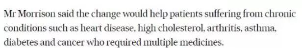莫里森表示,这一改变将帮助更多患有高胆固醇、关节炎、心脏病、哮喘、糖尿病和癌症等慢性病患者,他们可以获得多种药物治疗。
