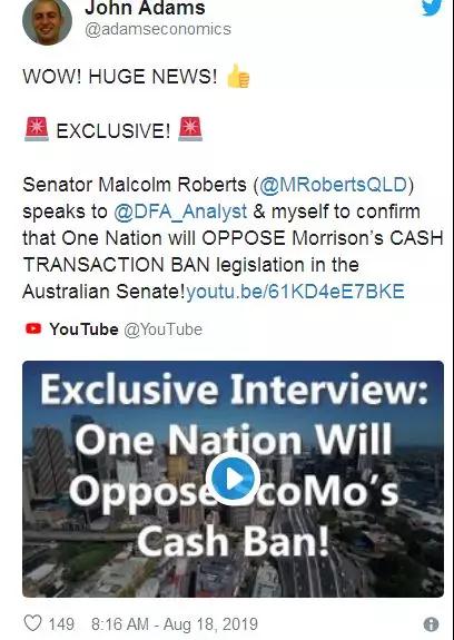 经济学家John Adams就说了,限制大额现金交易,这是在侵犯澳洲人的公民自由。