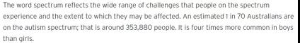 事实上在澳洲,根据自闭症患者协会的数据显示,每70名澳大利亚人中就有1人患有自闭症。其中,患有自闭症的男孩是女孩的四倍。