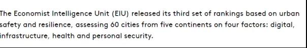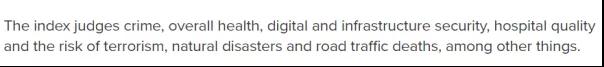 据悉该报告还将犯罪、整体健康、数字和基础设施安全、医院质量、恐怖主义风险、自然灾害和道路交通死亡等因素包含在内。