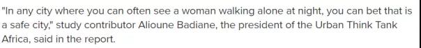 该研究的撰稿人、非洲城市智库负责人的Alioune Badiane在报告中说:“假如你能在城市看到女性夜间独自行走,可以肯定这会是一个安全的城市。”