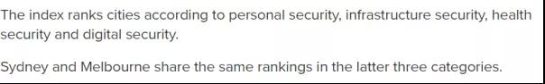 据9News称悉尼和墨尔本在基础设施安全、健康安全和数字安全上排名相同。但悉尼在个人安全问题上的优势足以在排名中比墨尔本领先5名。