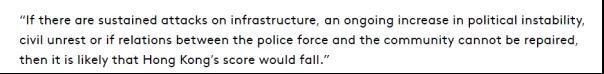 “如果基础设施遭到持续袭击,社会不稳定、暴力持续加剧,或者警方与社区之间的关系无法修复,那么香港的得分/排名很可能会下降”。