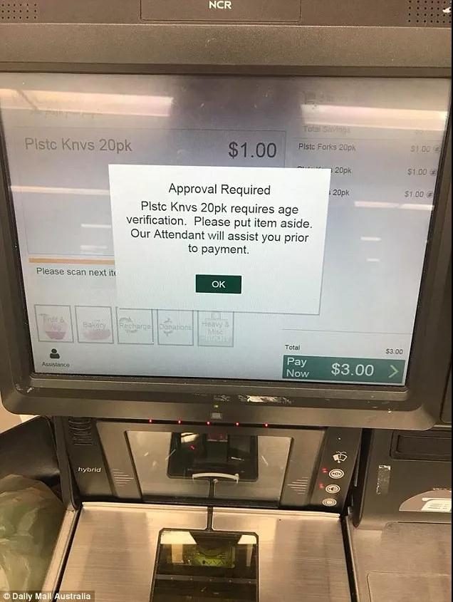 据悉,当顾客在自助结账柜台扫塑料刀具时将会看见弹出一条警告消息,而且服务警铃会闪红灯。