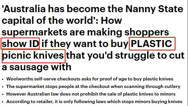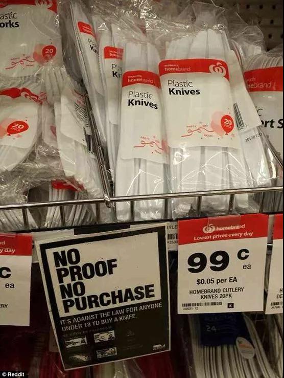 目前,在部分Woolworths店里,摆放塑料刀具的货架前甚至会摆放一张告示牌在一旁。上面写着“没有证明禁止购买”。