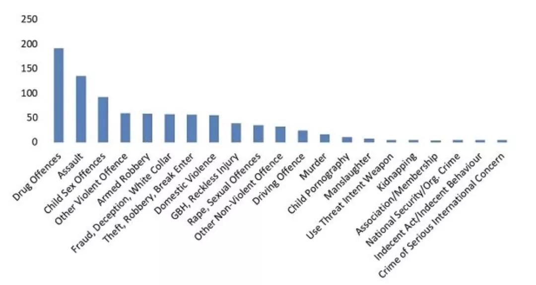 其中包括毒品犯罪,而殴打和儿童性虐待也是最常见的罪行。