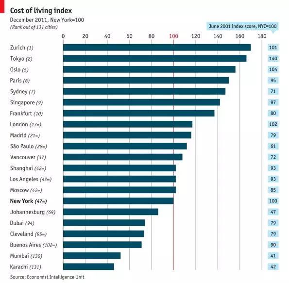 在对比全世界133个主要城市,160项商品及服务的价格水平,