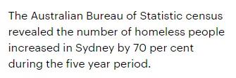 根据澳洲统计局(ABS)的调查统计,在2011-2016年的短短5年时间里,悉尼流浪汉人数暴涨了70%,约超过11万人无家可归!