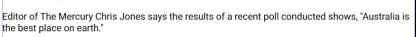 据Sky News报道,《The Mercury》的编辑Chris Jones表示,最近一份ABC的民意调查显示,澳洲的确是地球上最好的地方。