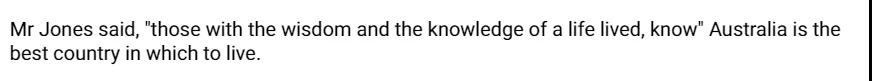对此,Jones称,越是拥有智慧和知识的人,就越知道澳洲是全球最适合生活的国家。