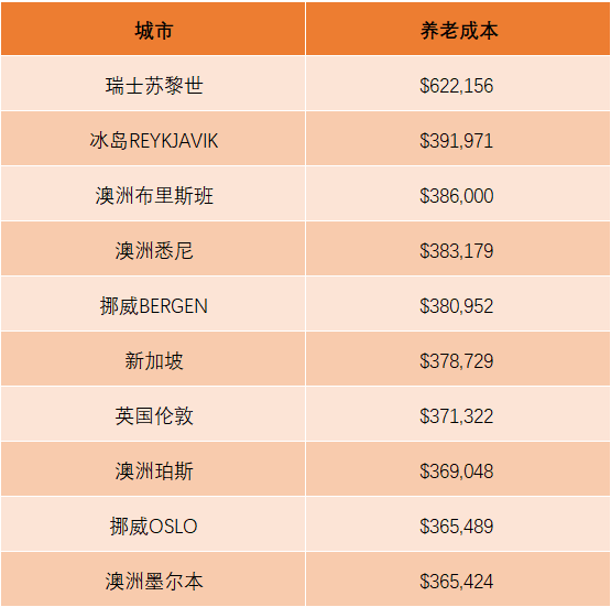 从具体数据来看,布里斯班以38.6万澳元的个人养老成本位居第三,仅次于瑞士的苏黎世和冰岛首都Reykjavik。紧随布里斯班的则是悉尼——以383179澳元的个人养老成本位居第四。珀斯则位居第八,该地的个人养老成本也达到了369048澳元,而墨尔本则以365424澳元的个人养老成本位居第十。