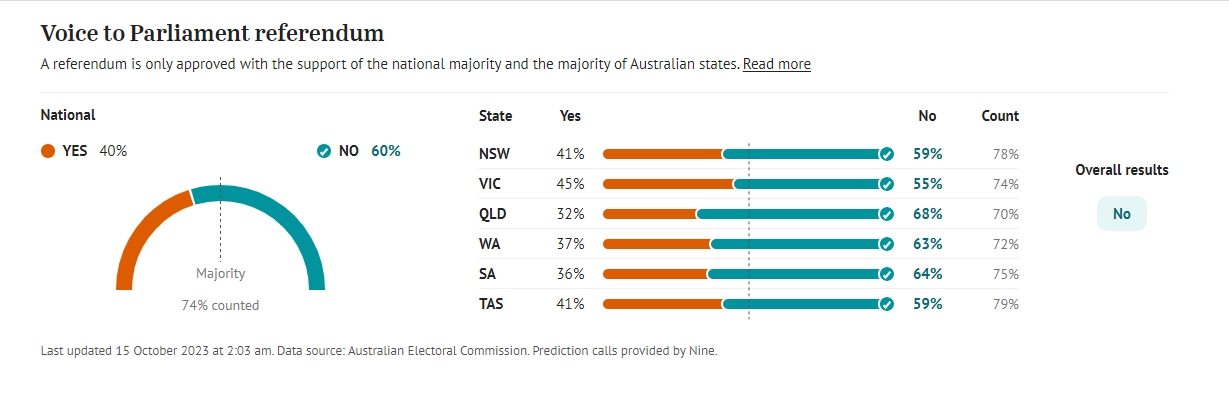周六晚7点过后不久,也就是东海岸投票结束仅一小时后,选民的决定就已经明朗。在晚上10点的计票中,新州58%的选民投了反对票,而维州54%的选民反对。昆州反对票67%,南澳则以64%的反对票紧随其后。