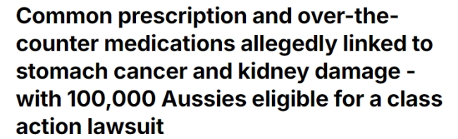 目前,总部位于墨尔本的律师事务所Shine Lawyers已对质子泵抑制剂 (PPI) 等药物的健康影响展开集体诉讼调查,能参与集体诉讼的人需要满足一个条件—“在开始服用一种(或多种)PPI 药物后被诊断出患有胃癌或肾衰竭”,而即便如此,预估仍有10万澳人参与此次诉讼。