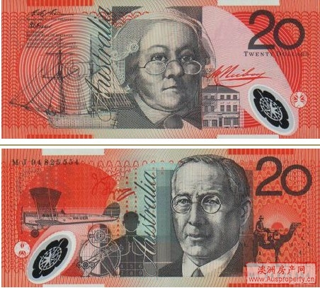 ◎正面:澳大利亚女企业家莱蓓。背景中的帆船是莱蓓经营的“水星号。背景中的建筑是悉尼乔治大街上属于莱蓓的仓库。透明视窗中的图案是与航海息息相关的指南针图案。在面额数字“20”和透明视窗之间,是莱蓓的签名。