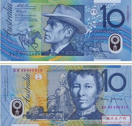 ◎背面:澳大利亚诗人吉尔默女爵。背景是吉尔默女爵的作品中描述的场景——运送羊毛的马车队。背景是吉尔默女爵晚年肖像。在面额数字“10”和系列号之间是吉尔默的签名。最左边的手写体是吉尔默最著名的爱国诗篇《不许敌人抢夺我们的果实》
