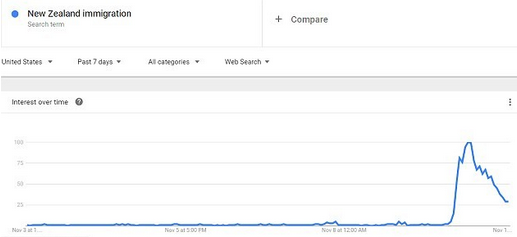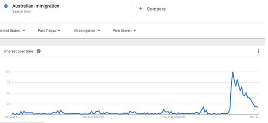 谷歌关键词“澳洲移民”和“新西兰移民”成为过去24小时内最热搜关键词,美国东部时间凌晨4点搜索词达到高峰。