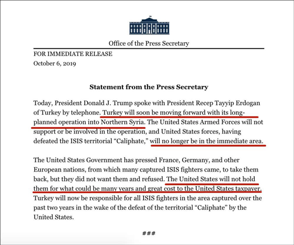今天,特朗普总统与土耳其总统埃尔多安通了电话。土耳其将很快推进准备已久的行动,出兵叙利亚北部。美国军队既不支持也不卷入这一行动,美国军队在挫败“伊斯兰国”后,也将不继续留在这一地区。