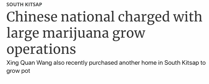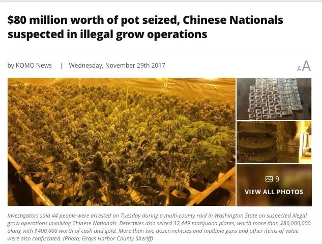 例如,2017年,华盛顿西部就破获了一起重大的违法种植大麻案件,没收了价值高达8,000万美元的大麻、26辆车及多把枪支。逮捕的44名涉案人员,全部都是中国公民!