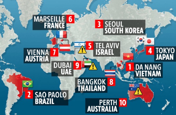 以色列的Tel Aviv和阿联酋的迪拜都进入了前十名。然而,尽管这两座城市仍很受游客欢迎,但随着美国和伊朗之间的紧张局势升级,这两个地区的政府都向西方人发出了警告,担心其炸弹可能会打中度假者。