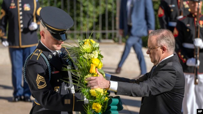 澳大利亚总理安东尼·阿尔巴尼斯(Anthony Albanese)2023年10月23日在美国首都华盛顿郊外的阿灵顿国家公墓献花圈。(美联社)