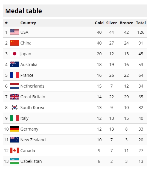这届奥运会上,中美两个体育大国之间在金牌榜上的竞争也是十分激烈。最终美国位居第一,中国第二。两个国家虽然金牌数相当,但是美国奖牌总数(126)要远超过中国的91块。