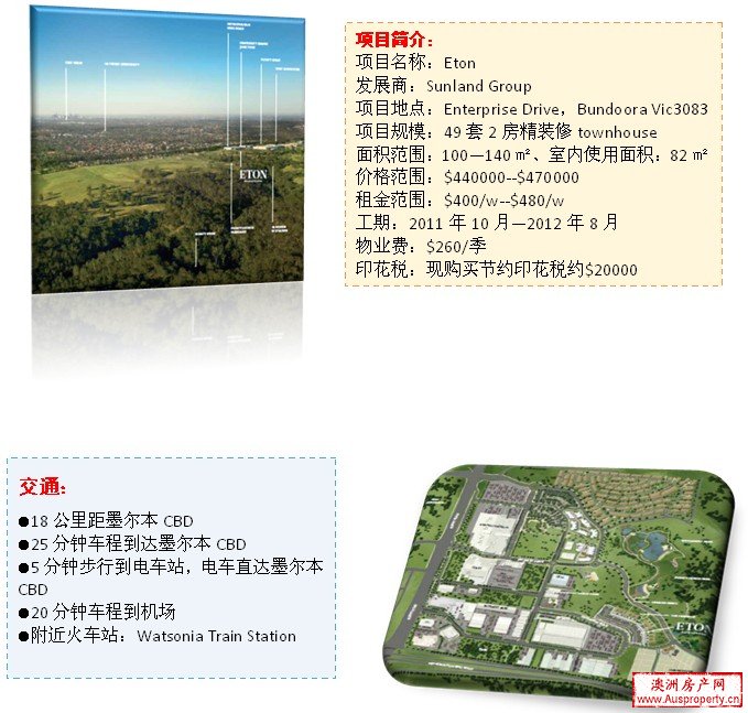 近日,Sunland Group集团重磅推出了全新的顶级项目Eton。青葱宁静却不远离于市是对Eton最好的描述。Eton项目在墨尔本东北区,距离墨尔本CBD18公里,其在众多的项目中拥有极高的性价比,无论投资和自住将会带来巨大的升值潜力,集交通、购物、教育资源为一体,有四种不同风格的房型可供选择。集众优势于一身的Eton无疑成为了客户追捧的对象,为此该地区出现过众多客户提早一个星期在现场扎营排队等待发售的盛况。