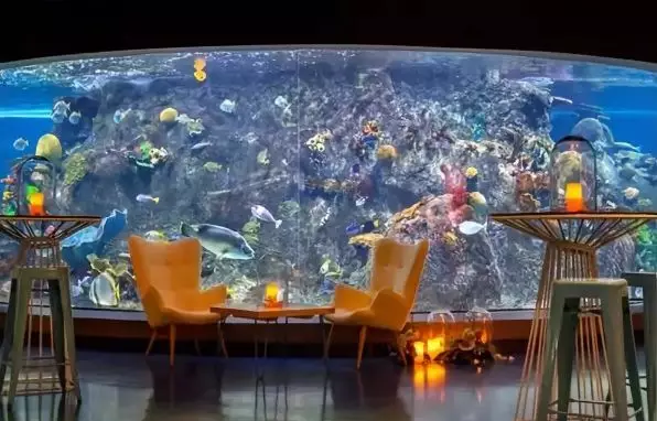 水上还不够浪漫,那么海底风格的晚餐呢?在220万升的水族馆里,你可以置身于鲨鱼、黄貂鱼和丰富的鱼类之中,饱览珊瑚环礁上生机勃勃的热带鱼。从南极而来,穿着得体燕尾服的企鹅们,它们能当好服务员吗?