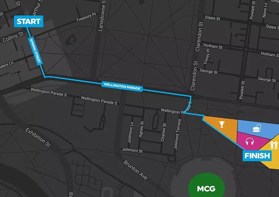 游行队伍将从Collins St和Spring St交界处始发,并途经Wellington Pde到达MCG。
