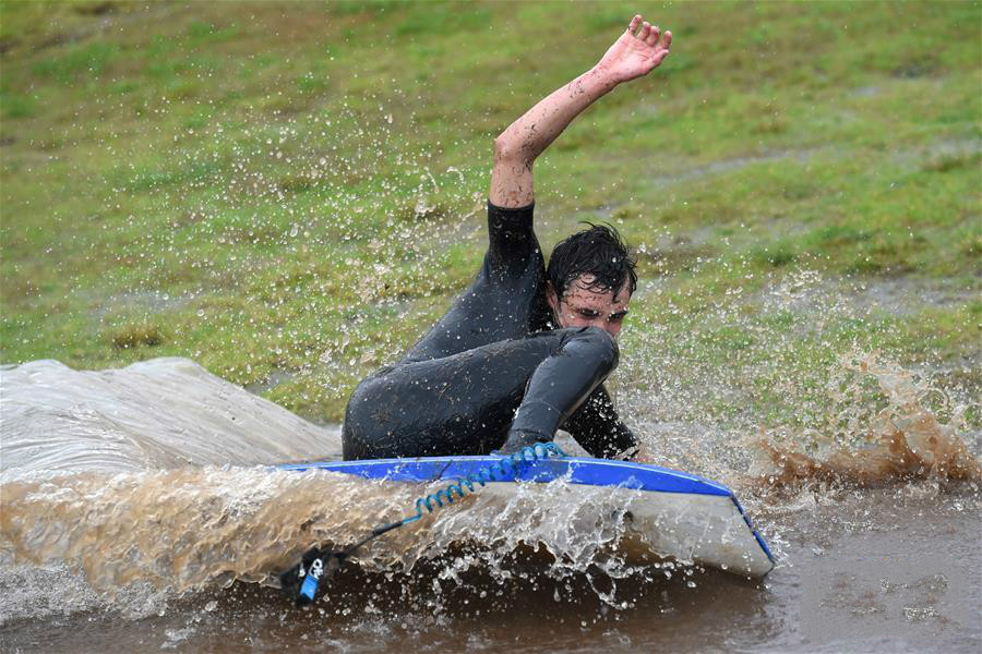 悉尼一名男子在因雨水形成的池塘里玩冲浪板