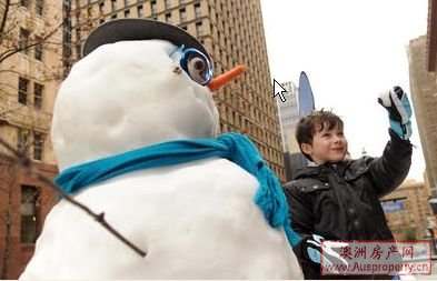 5岁的Ryan Melick在Martin Place广场和雪人合影(澳联社)