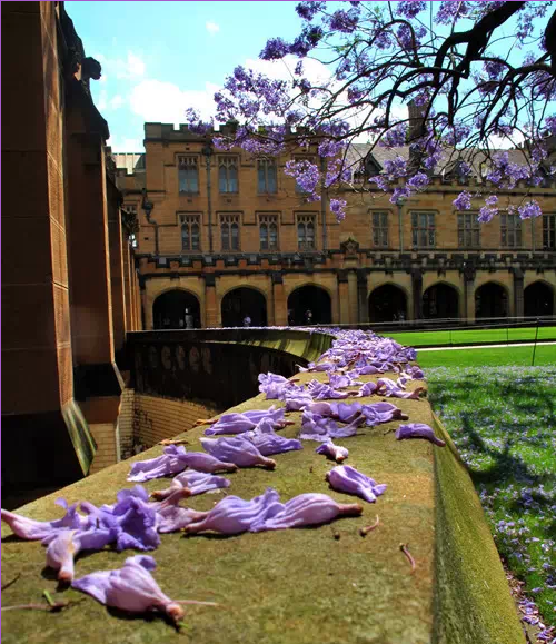 当漫天蓝紫色的花瓣,在悉尼大学校园飞舞飘落的时候,考试的季节就到了。蓝花楹,传说它还叫考试花。因为在澳洲,它盛开在10月至11月之间,正是学校里大波考试来临的时节。在悉尼大学,传说如果蓝花楹绽放了,你却还没开始复习,不小心被花瓣砸到头顶,可是要挂科的。