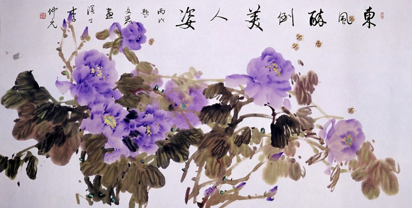 黄文丽擅长花鸟画,工写极佳,尤其以写意牡丹、玫瑰闻名。其作品清馨典雅,俊秀飘逸。尤其水墨牡丹,既灵动又含蓄,既传统又创新,更具代表性。从她的画作中可深深感受出她对大自然的热爱及对美好生活的向往。她创作的大景花鸟画,更使人耳目一新,如临其境。