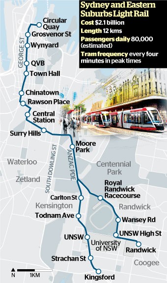 这个位于城市东南部、从环形码头到Kensington和Randwick、12公里长的轻轨线路,投资成本为21亿澳元,然后还不包括购买电车。