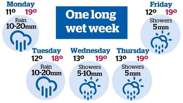 他预计悉尼周一的降水量为10到15毫米,周二20到25毫米,周三10到15毫米,周四和周五也会有零星小雨。