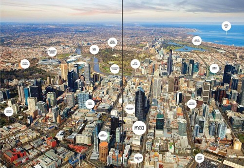 MY80地处墨尔本心脏位置,处于皇家理工大学和维多利亚皇后市场这500米距离的中间,距离著名学府墨尔本大学仅1公里,他独特的中间位置赋予了他是一个非常理想的理财投资项目,总高达50多层,可以俯瞰墨尔本全城。