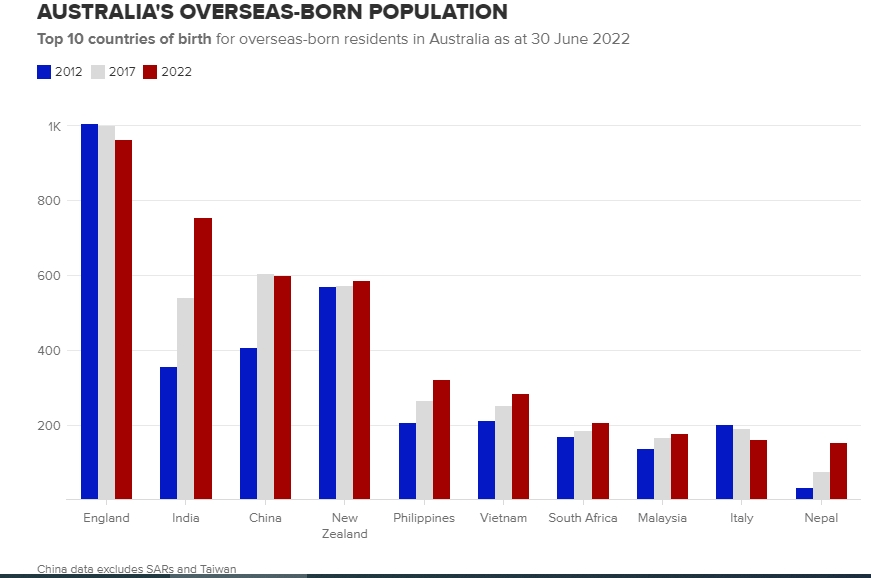 来自英国的移民人口最多,达到96.1万人,这也是英国殖民澳洲以来保持的纪录。在印度出生的人是海外出生人群中的第二大群体,2022年有75.3万名移民。