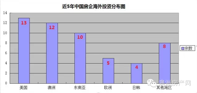 从投资区域来看,中国房企偏好集中在北美、欧洲、澳洲和东南亚等经济相对发达以及中国人聚居的城市和区域,其中美国投资13宗,位居首位,澳洲和东南亚分别为12和12宗。(详见“近5年中国主要房企海外投资表”)