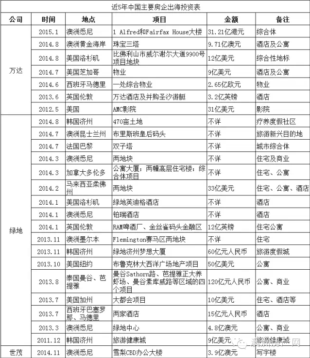 仲量联行报告显示,2014年中国房地产投资在海外市场的投资额创下新高,达到165亿美元,比2013年增长了46%。其中,欧洲成为最受欢迎的投资目的地,共吸引了超过55亿美元的投资;2014年澳大利亚成为中国投资者青睐的新目标市场,流入资本超过30亿美元,25亿美元资本则流入美洲。