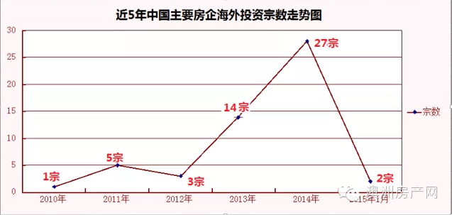 腾讯房产根据公开资料综合整理显示,中国主要房企近5年来出海投资大约52宗,发现2013年为中国房企大规模“出海”元年,发生了13宗交易,而2014年投资规模大大加码,达到27宗,增幅接近100%。