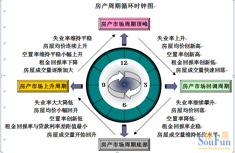 一、投资介入时机最为重要(Timing),而非位置。 如何判断房地产投资介入的最佳时机和趋势呢?从海外地产判断市场趋势的经验来看,通常的判断依据是房地产投资的时钟原则: