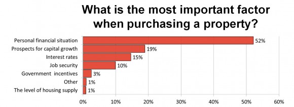 大多数的人们认为最重要的因素是个人财政状况,占52%。有趣的是,房产市场的资产升值前景也是重要因素之一,有略低于20%的人认为这是最重要的。15%则选择了利率水平,只有10%的人认为工作的稳定性是最重要的因素。